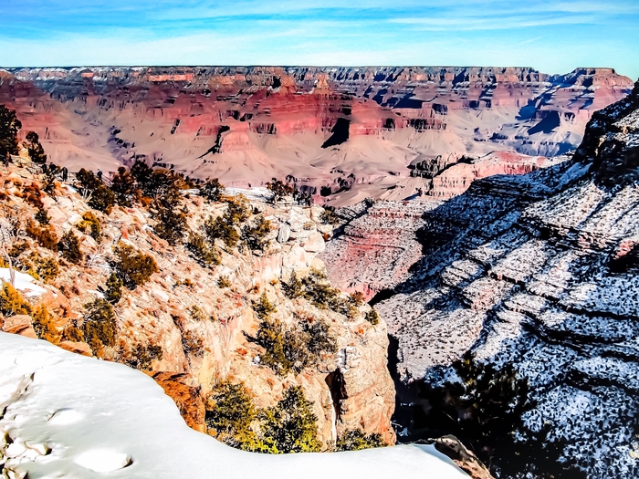 desert at Grand Canyon national park, USA in winter with snow and blue sky