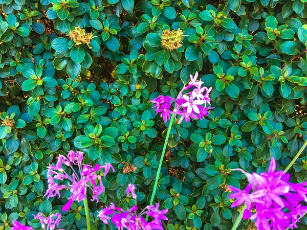 blooming purple flowers with green leaves background