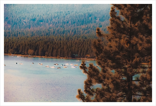 pine tree and boats on the water at Lake Tahoe Nevada USA
