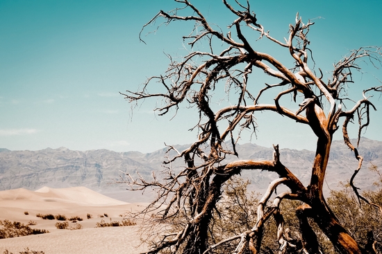 Tree branch in the sand desert and mountain view at Death Valley national park California USA