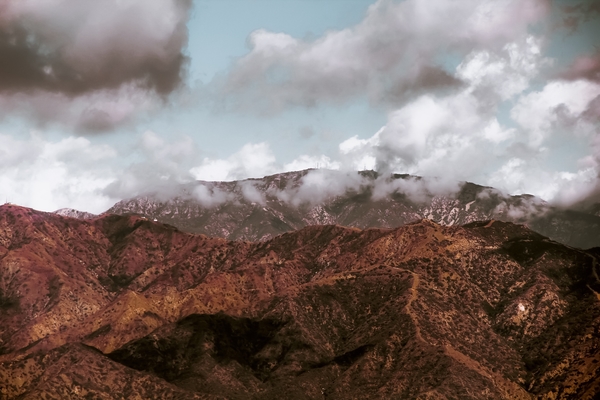 View from the hiking trail with mountain view and blue cloudy sky to Hollywood sign Los Angeles California USA