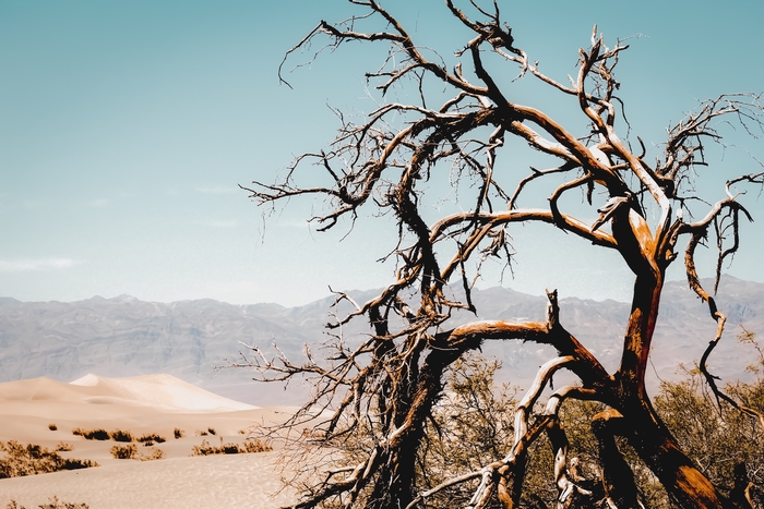 Tree branch in the sand desert and mountain view at Death Valley national park California USA