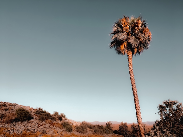 isolated palm tree with mountain and blue sky background