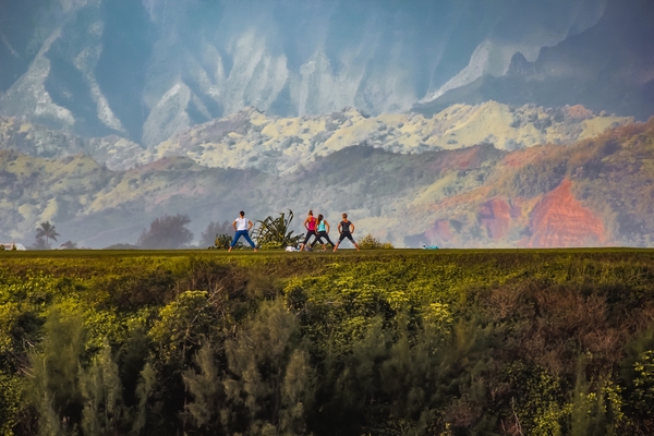 A group of people exercise on the mountain with beautiful view at Kauai, Hawaii