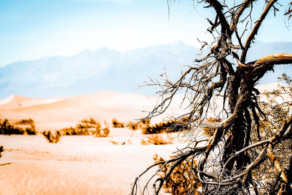 Tree branch with sand desert and mountain view at Death Valley national park California USA