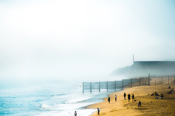 blue ocean and sandy beach with foggy sky at Point Mugu State Park, California, USA