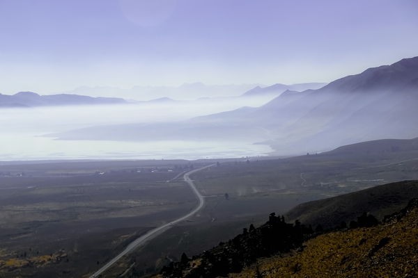 road with foggy sky and mountains scenic in California
