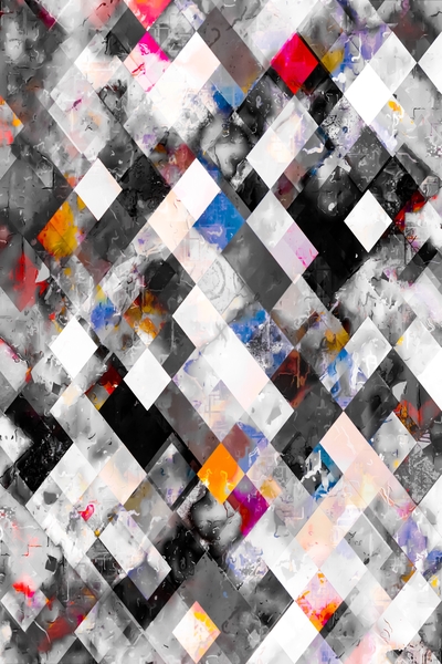 geometric pixel square pattern abstract art in blue pink yellow black and white