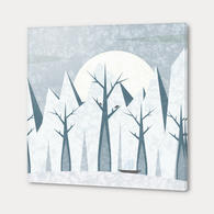Fantasy illustration of an arctic landscape, where a boat is sailing by big mountains and strange trees with birds.