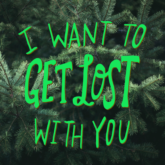 Hand lettered type "I want to get lost with you", layered over pine tree photograph.