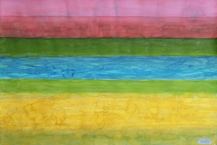 Pink, green, blue and yellow bright stripes are painted in an almost strict yet picturesque way.