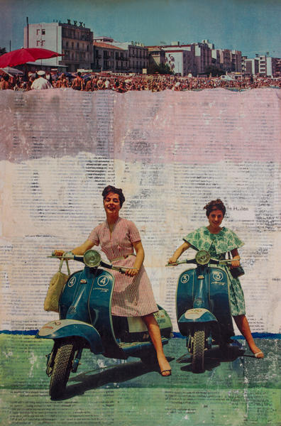 Two girlfriends on there scooters, having a great summer together, in an Italian beach town. I assemble original photography, assorted papers, acrylics, oil, charcoal, ink and pencil in my w