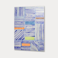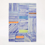 A blue grid is filled with with blue vertical, horizontal and diagonal striped rectangles. Few spots however are left for the most compelling and wonderful colors in this context, revitali