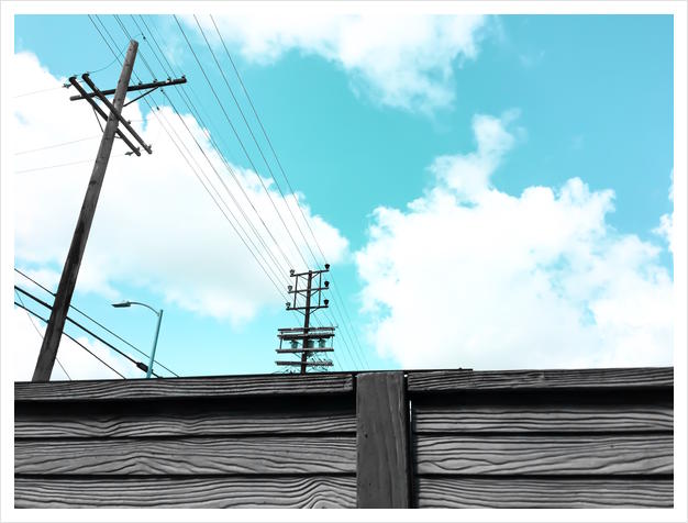 electric pole with wooden wall and blue cloudy sky in the city