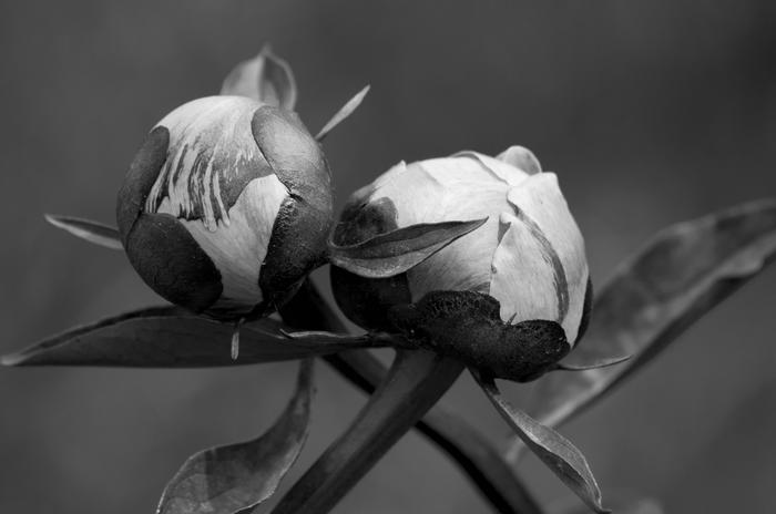 Close up Unbloomed Peonies in Summer Garden Black and White Photography.