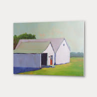 Two barns sit in a green landscape in brilliant sun with purple shadows.