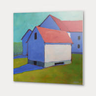 White barns, red roofs and strong blue shadows with golden landscape and cyan sky