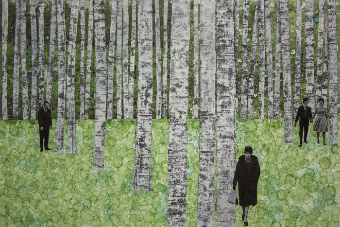 A surrealistic landscape with birch trees. Are these people in place or taken away from their urban existence? I assemble original photography, assorted papers, acrylics, oil, charcoal, ink,
