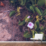 blooming pink flower with green leaves on the ground