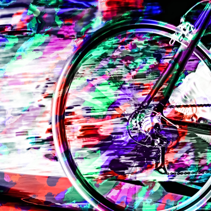 bicycle wheel with colorful abstract background in green red and purple