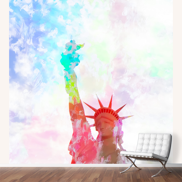 Statue of Liberty with colorful painting abstract background in red pink blue yellow