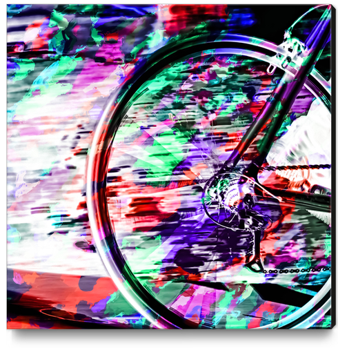 bicycle wheel with colorful abstract background in green red and purple