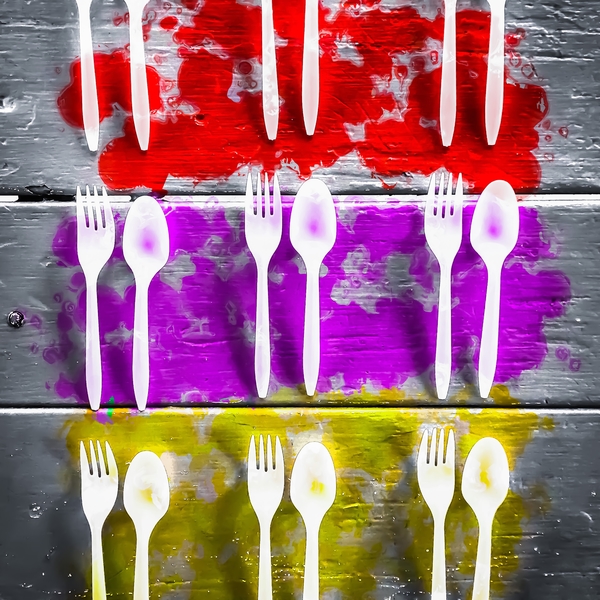 fork and spoon with splash painting texture abstract background in pink red yellow